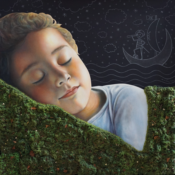 Öl auf Karton, Dispersion, Buntstift, handgefert. Kunstmoos, Waldboden