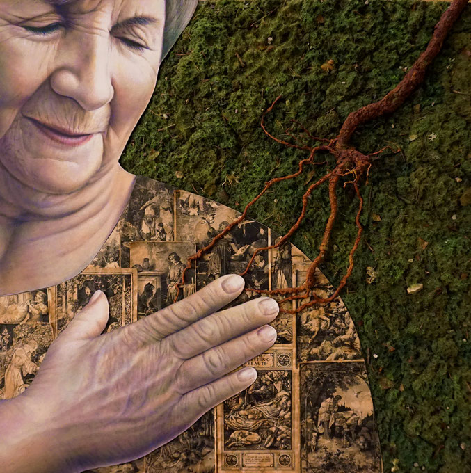 Öl auf Karton, auf Holz appliziert, faksimilierte Märchenbilder, Kunstmoos, Waldboden, Holzwurzel